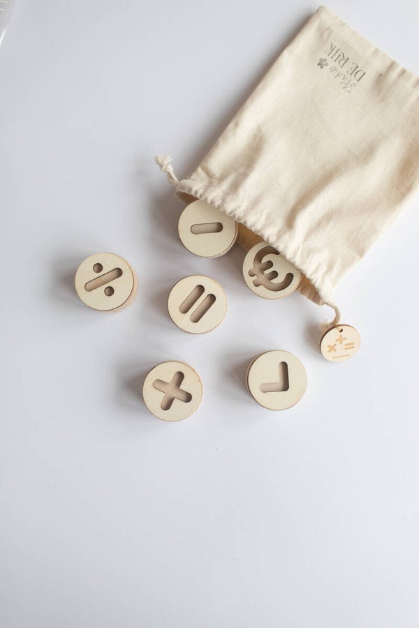 Maak rekenen leuk en creatief met deze set grote houten stempels. Ideaal om kinderen spelenderwijs kennis te laten maken met getallen en rekenkundige bewerkingen. Perfect te gebruiken in kinetisch zand, klei of andere materialen.
