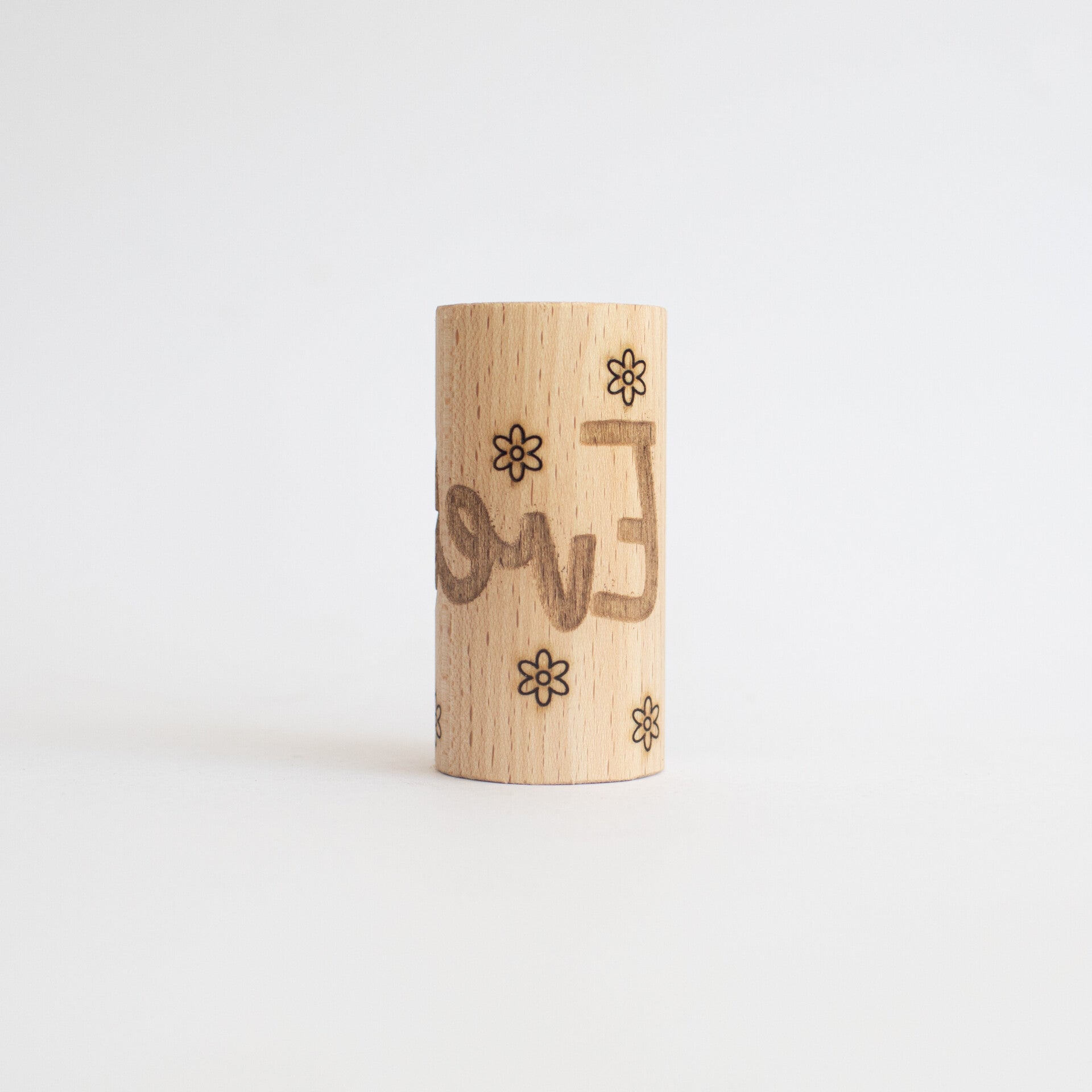 Deze robuuste houten roller is ideaal voor gebruik met klei, kinetisch zand of deeg. Dankzij de mogelijkheid om een naam naar keuze te laten graveren, wordt elke roller uniek. De lengte van de naam bepaalt de grootte van de afdruk, met een maximum van 5,5 cm hoog. Voor een extra persoonlijke touch kunnen optionele vormen of afbeeldingen toegevoegd worden, zoals bloemen, sterren of hartjes (tegen meerprijs).