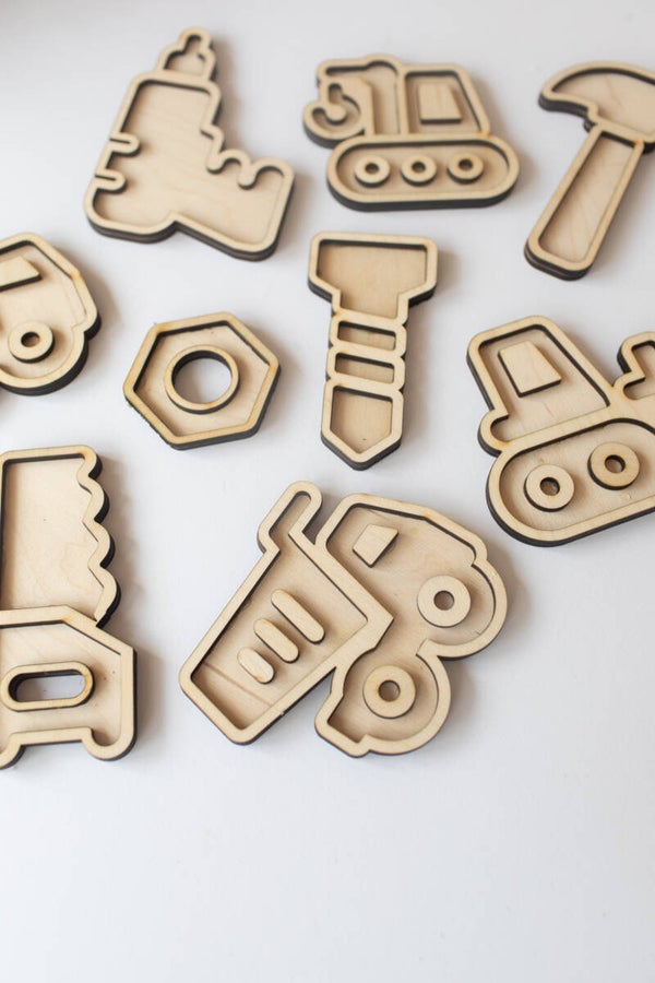 Duik in de wereld van werktools met deze houten speeltrays! Perfect voor sensorisch spel en het ontwikkelen van de fijne motoriek. Vul de trays met zand, rijst, of andere materialen en laat kinderen de wereld van gereedschap en kluswerk ontdekken!