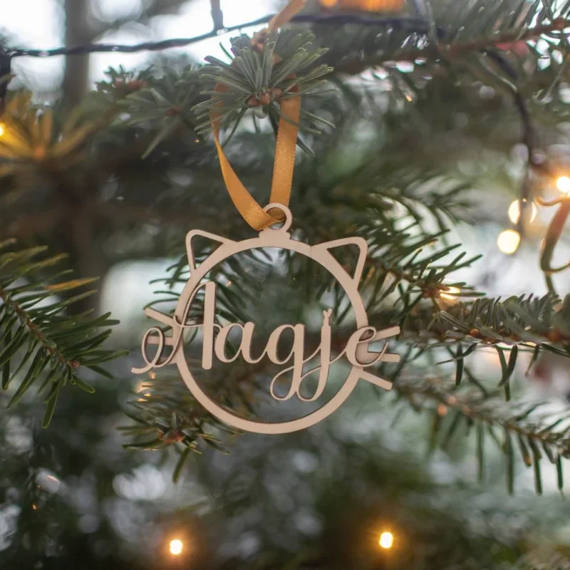 Ho Ho Ho! Een gepersonaliseerde kerstbal van hout speciaal voor jou kat. De houten kerstbal wordt gepersonaliseerd met een naam die als 2e laag op de kerstbal zit. Ook heel erg leuk om als persoonlijk kado te geven. De positie en hoeveel de naam uitsteekt aan de buitenzijdes is afhankelijk van de lengte van de naam, elke kerstster wordt met liefde en met de hand gemaakt.
