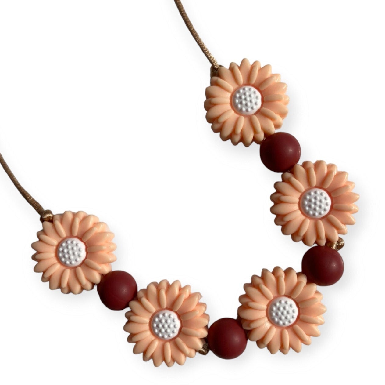 Deze vrolijke kinderketting is perfect voor modebewuste kinderen die houden van kleur en stijl. Het speelse ontwerp met perzikkleurige daisy bloemetjes en rode balletjes zorgt voor een levendige, frisse look die elke outfit opvrolijkt. Het zandkleurige koord in combinatie met de groene sluiting geeft de ketting een frisse, moderne look die gemakkelijk te combineren is met verschillende outfits.