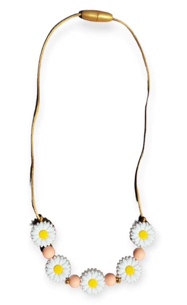 Deze vrolijke kinderketting is perfect voor modebewuste kinderen die houden van kleur en stijl. Het speelse ontwerp met witte daisy bloemetjes en perzikkleurige balletjes straalt zachtheid en vrolijkheid uit. Het gouden koord in combinatie met de gouden sluiting geeft de ketting een frisse, moderne look die gemakkelijk te combineren is met verschillende outfits.