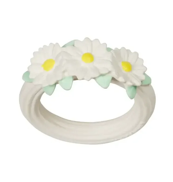 Deze witte bijtring met madeliefjes van natuurlijk rubber is het ideale bijtspeeltje voor baby’s die last hebben van doorkomende melktandjes. Het zachte, flexibele rubber biedt een comfortabele afleiding en helpt het ongemak te verlichten. Het ergonomische ontwerp ligt prettig in kleine handjes en stimuleert tegelijkertijd de grip en tactiele ontwikkeling van je kindje. De bijtring is gemaakt van 100% natuurlijk rubber van de Hevea-boom, volledig veilig en vrij van schadelijke stoffen.
