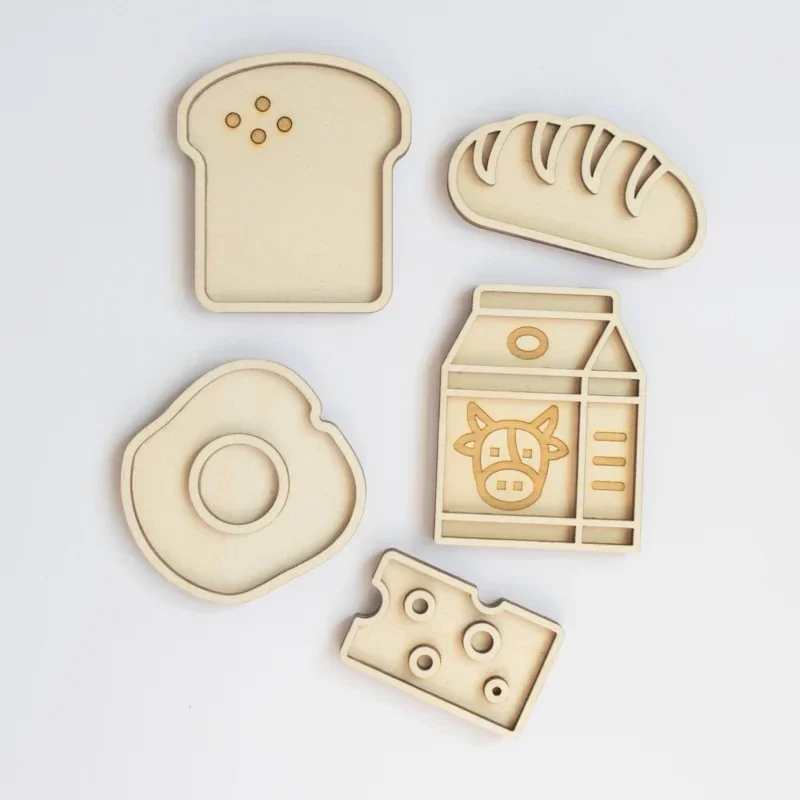 Breng het gezellige ontbijt naar huis met deze houten speeltrays en laat kinderen spelenderwijs hun ideale ontbijtje samenstellen!
