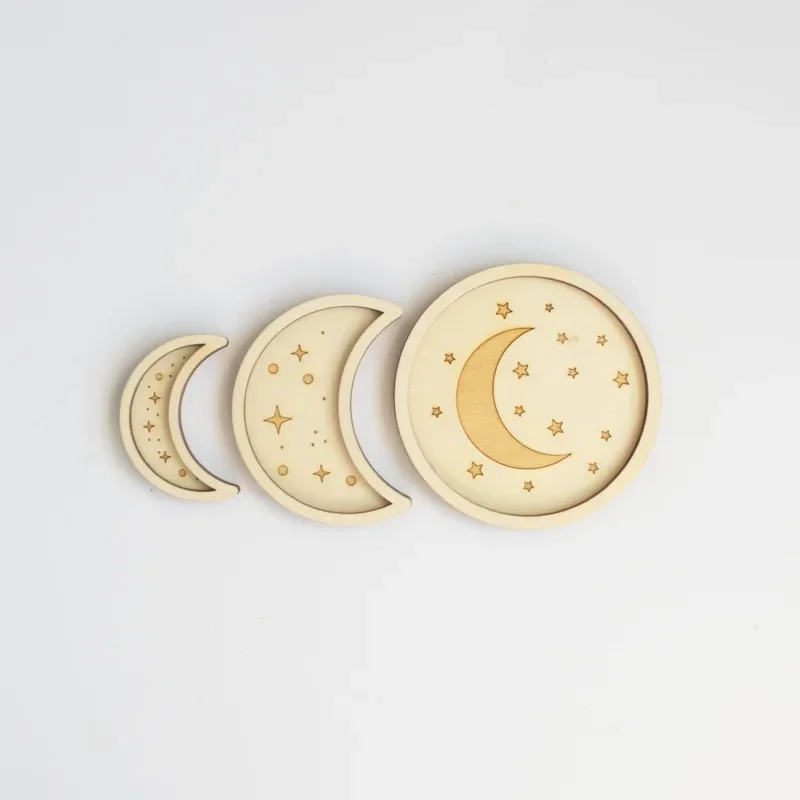 Verken de wonderen van de nachtelijke hemel met deze houten speeltrays in een maanfasen-thema! Perfect voor sensorisch spel en het ontwikkelen van de fijne motoriek. Vul de trays met zand, rijst of andere materialen en laat kinderen spelenderwijs de verschillende fasen van de maan ontdekken!