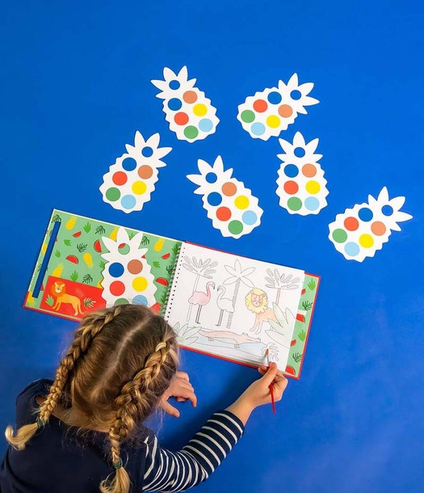 Creëer prachtige kunstwerken met dit handige en vrolijke spiraalgebonden schilderboek! Dit boek bevat 8 prachtige uitscheurbare tekeningen met een jungle-thema, perfect voor kleine kunstenaars die van avontuur houden. De bijgeleverde 8 verfpallets in ananasvorm maken schilderen extra leuk. Voeg eenvoudig wat water toe aan het penseel, strijk over de verf op het palet en begin direct met schilderen, zonder veel geknoei.