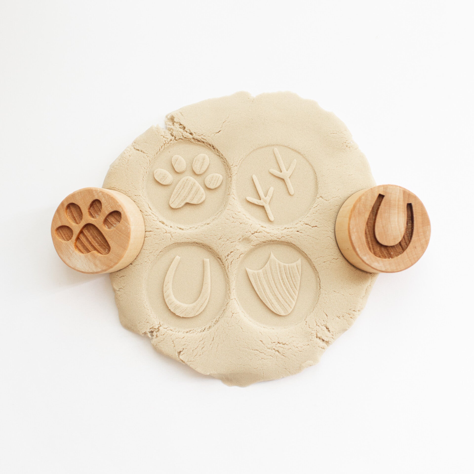 De diameter van 45 mm zorgt voor een comfortabele grip, ook voor kleine kinderhanden. De stempels zijn gemaakt uit één stuk massief hout, wat de duurzaamheid vergroot en zorgt voor een solide afwerking. Daarnaast zijn ze behandeld met een kindvriendelijke olie, die zorgt voor een veilige en beschermde oppervlakte. De randen zijn zacht geschuurd, wat het gebruik prettig en veilig maakt.