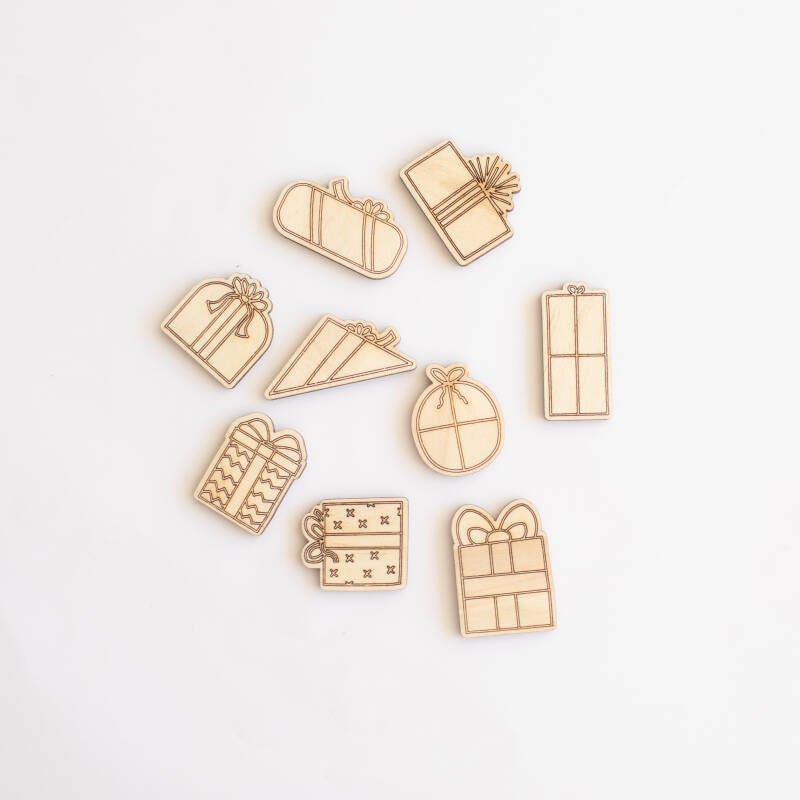 Aantal cadeautjes: 9 houten cadeautjes inbegrepen