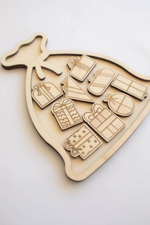 Breng Sinterklaasplezier naar je speelbak of seizoenstafel met deze houten speeltray! De zak heeft een hoogte van circa 18 cm en kan gevuld worden met de negen bijgeleverde houten cadeautjes, waardoor kinderen eindeloos kunnen spelen en ontdekken.