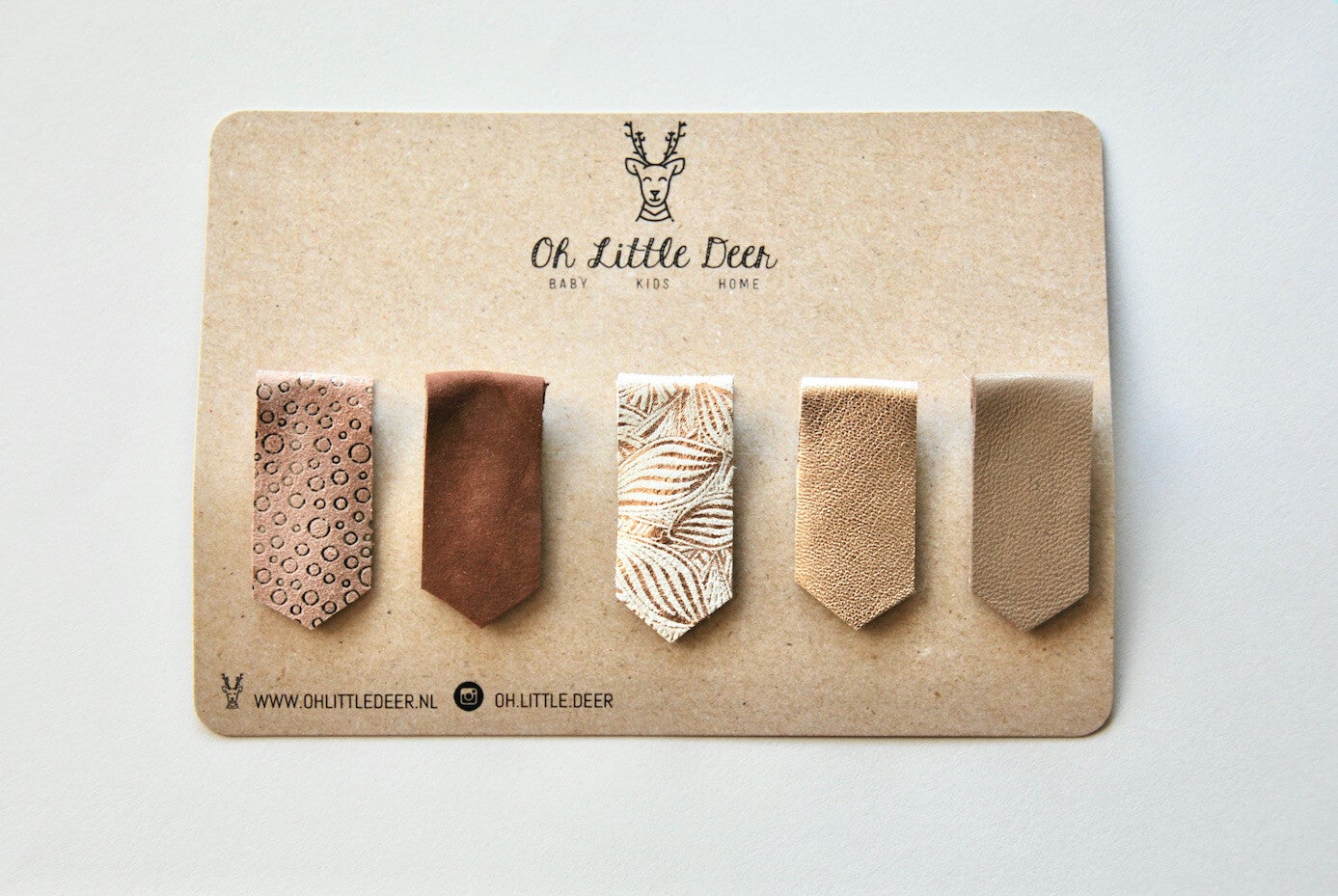 Maak elke look compleet met de Indie Blush set van 5 stoere leren haarspeldjes! Deze stijlvolle alligator clips passen bij elke outfit en zijn perfect voor zowel kleine als grotere meisjes. Dankzij de slimme ‘tandjes’ blijven de clips stevig zitten, zelfs in fijn haar, en zijn ze ideaal om plukjes omhoog te houden bij een nonchalante knot of gewoon als chique accessoire.